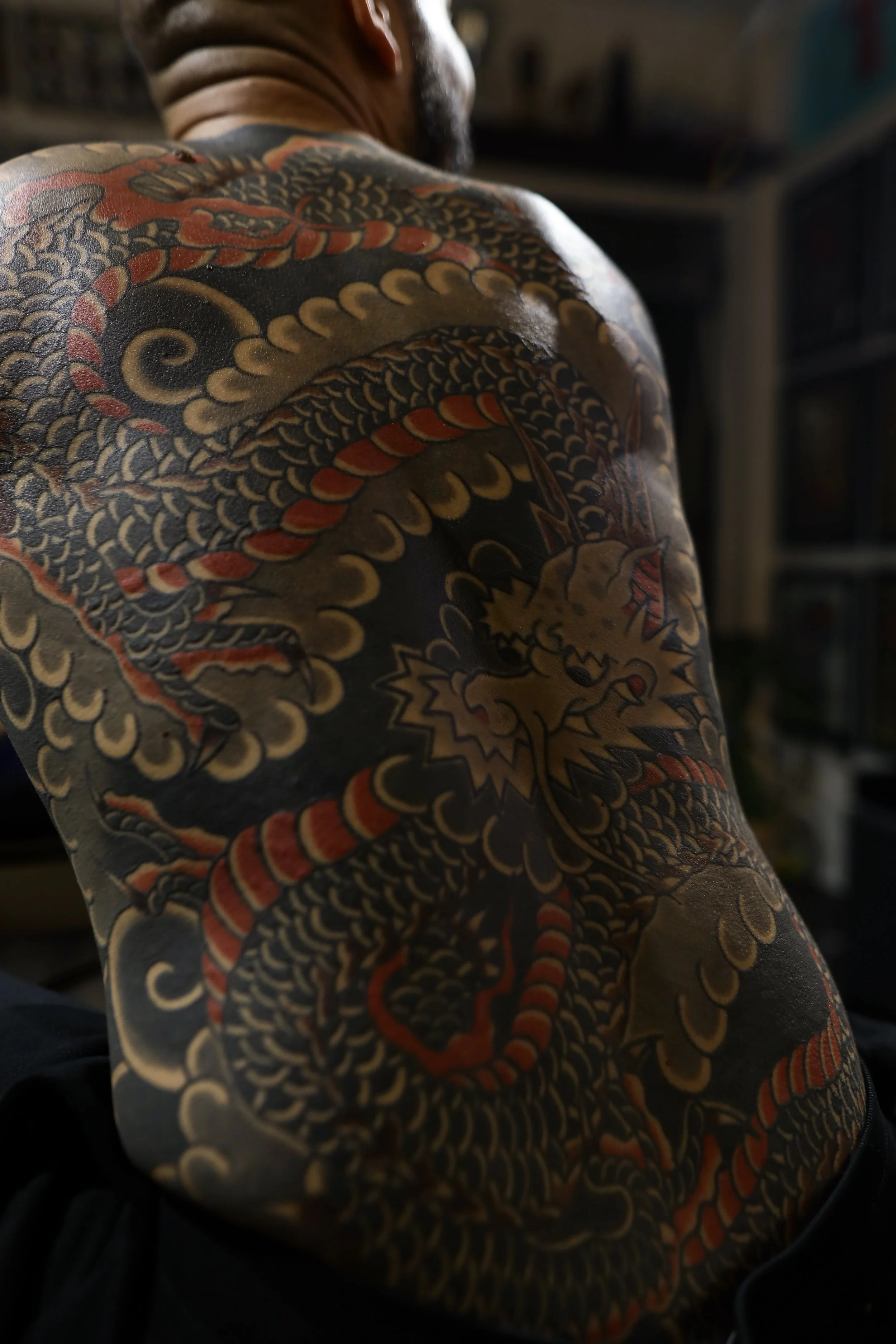Full-sleeve (shoulder to wrist), full-leg sleeve (thigh to ankle), and full back piece (neck to lower back) tattoos are available in Traditional Japanese Irezumi style, featuring a custom dragon design in black, grey, and red, with traditional background elements such as wind bars, waves, or clouds. Each design is fully customized to wrap around the designated area, ensuring detailed and cohesive artwork. The hourly rate for all pieces is $200 NZD per hour.